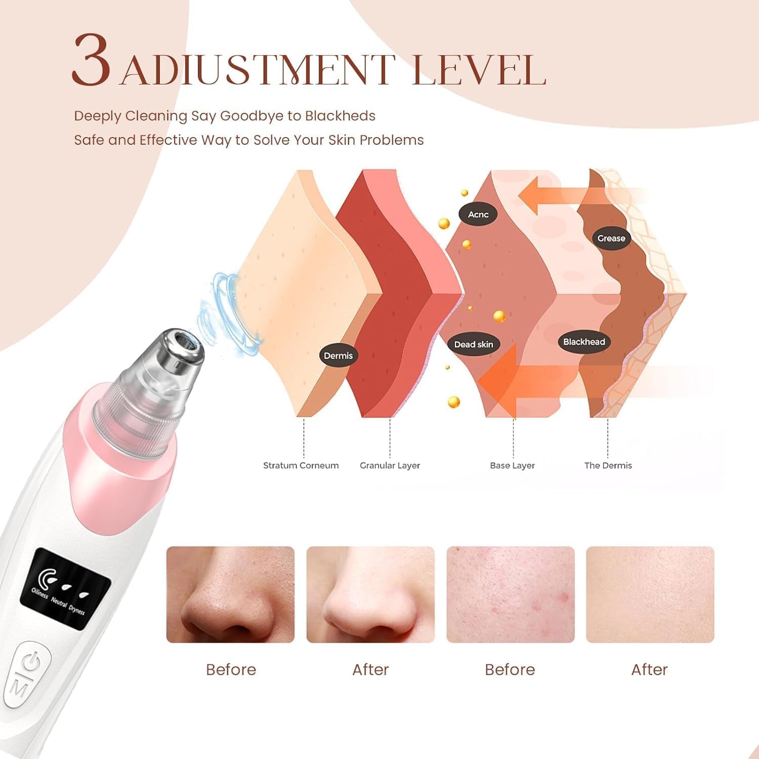 - 【3 Suction levels & 5 Suction Probes】–3 Different powerful suction levels suitable for different types of skin to achieve genuine deep cleaning. Pore vacuum cleaner level 1 is suitable for sensitive and dry skin, Level 2 is suitable for normal skin, Level 3 is suitable for combination and oily skin.Meanwhile , 5 replaceable probe are designed for different skin conditions,such as: clean up blackhead, remove dirt grease on the skin, reduce dead skin and fine lines.